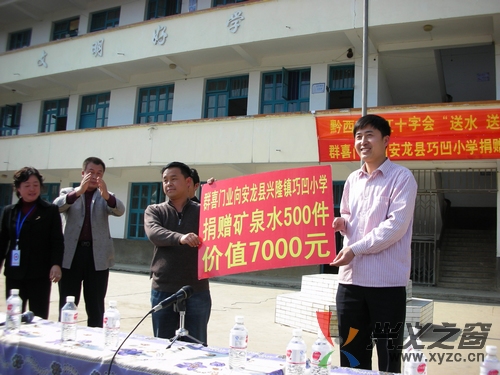在捐赠现场笔者了解到,浙江永康群喜门业有限公司的这次捐赠,是由家住安龙县龙广镇农民工何仕红和我州红十字会“牵”的“线”。今年4月中旬,现在身份为浙江永康群喜门业有限公司黔西南州总代理的何仕红,从新闻媒体了解到我州遭到百年不遇旱情,旱区群众饮水十分困难后,及时向公司经理汇报并建议公司开展捐赠活动,以尽企业的一份社会责任。公司经理单泽喜立即委托何仕红向我州红十字会明确表示捐赠的意向,州红十字会通过安龙县红十会的联系,决定把布依族聚居山区且学生饮水十分困难的巧凹小学确定为该公司的捐赠对象。4月19日这天,浙江永康群喜门业有限公司出资7000元购置了矿泉水并请车辆运送到了巧凹小学,缓解了该校340名学生的饮水困难。